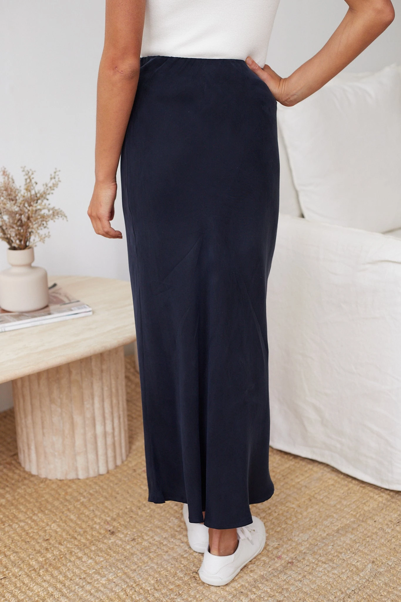 Our Admira Skirt comes in a navy blue colour. The staple of the moment, this skirt is highwaisted and features a fit to flare fit and long length hem. Pair with a long sleeved top!