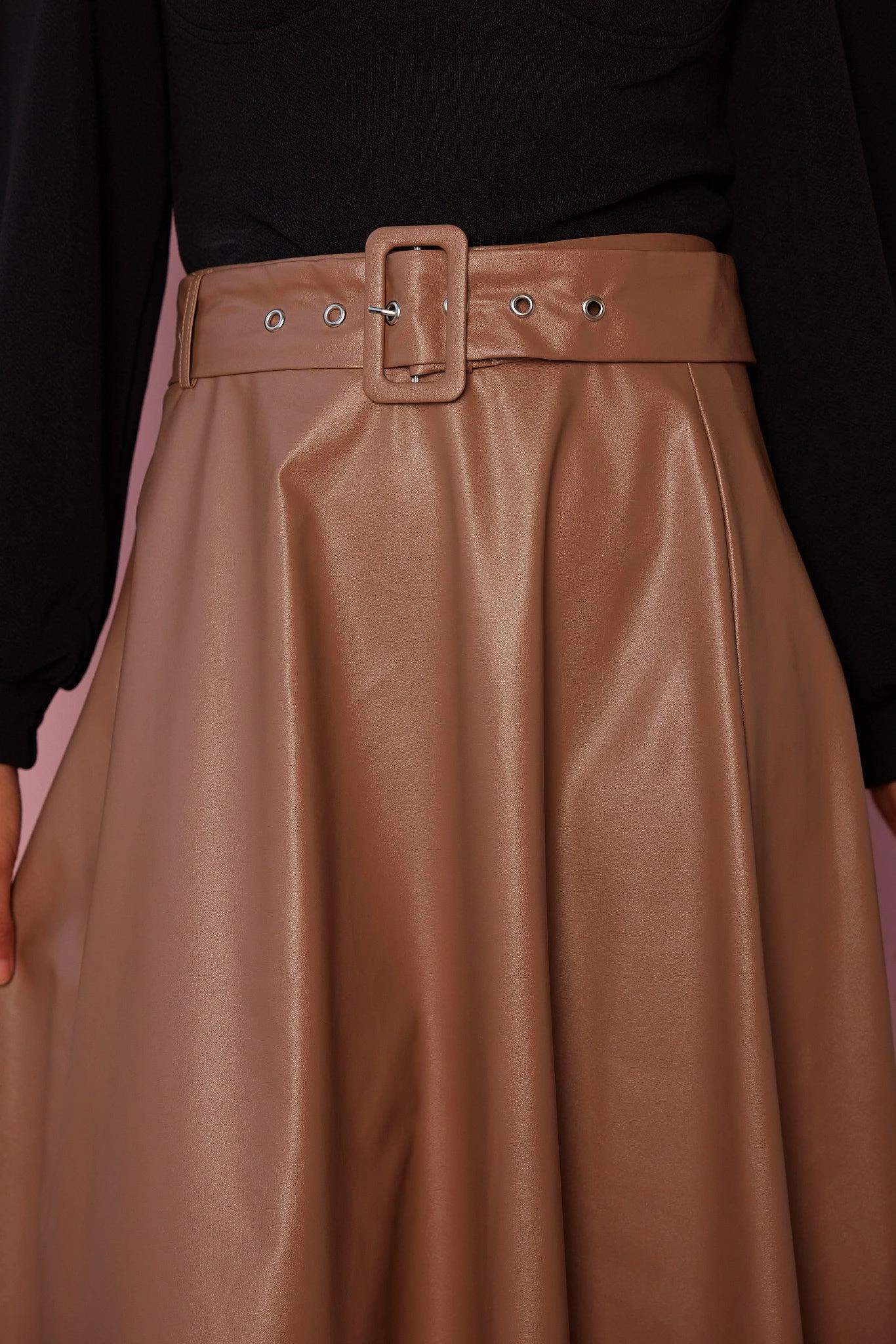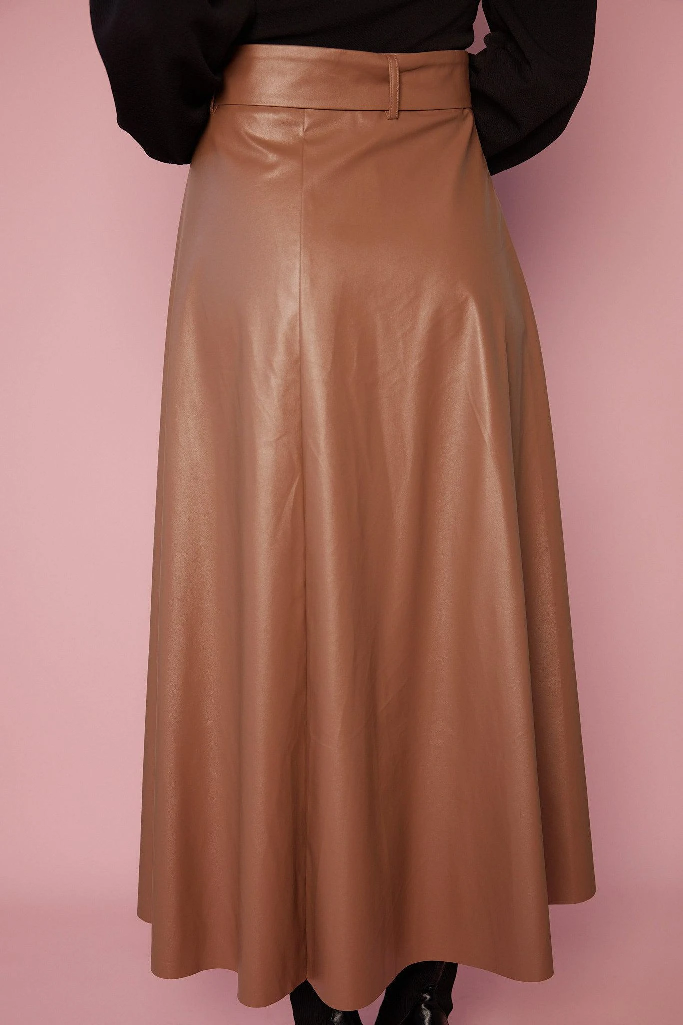 Our Bernyce Skirt comes in a natural brown colour. Making you look like you just stepped out of the runway, this number is designed with a high waist fit, belt with rectangular buckle, a-line silhouette and maxi length hem. Be edgy by pairing this with a knit top and a leather jacket!