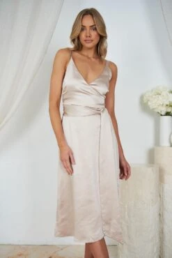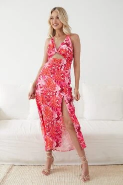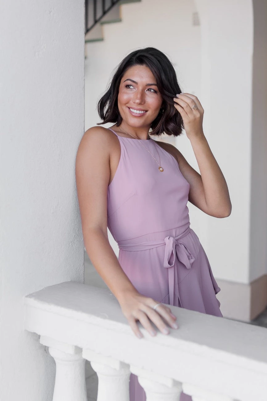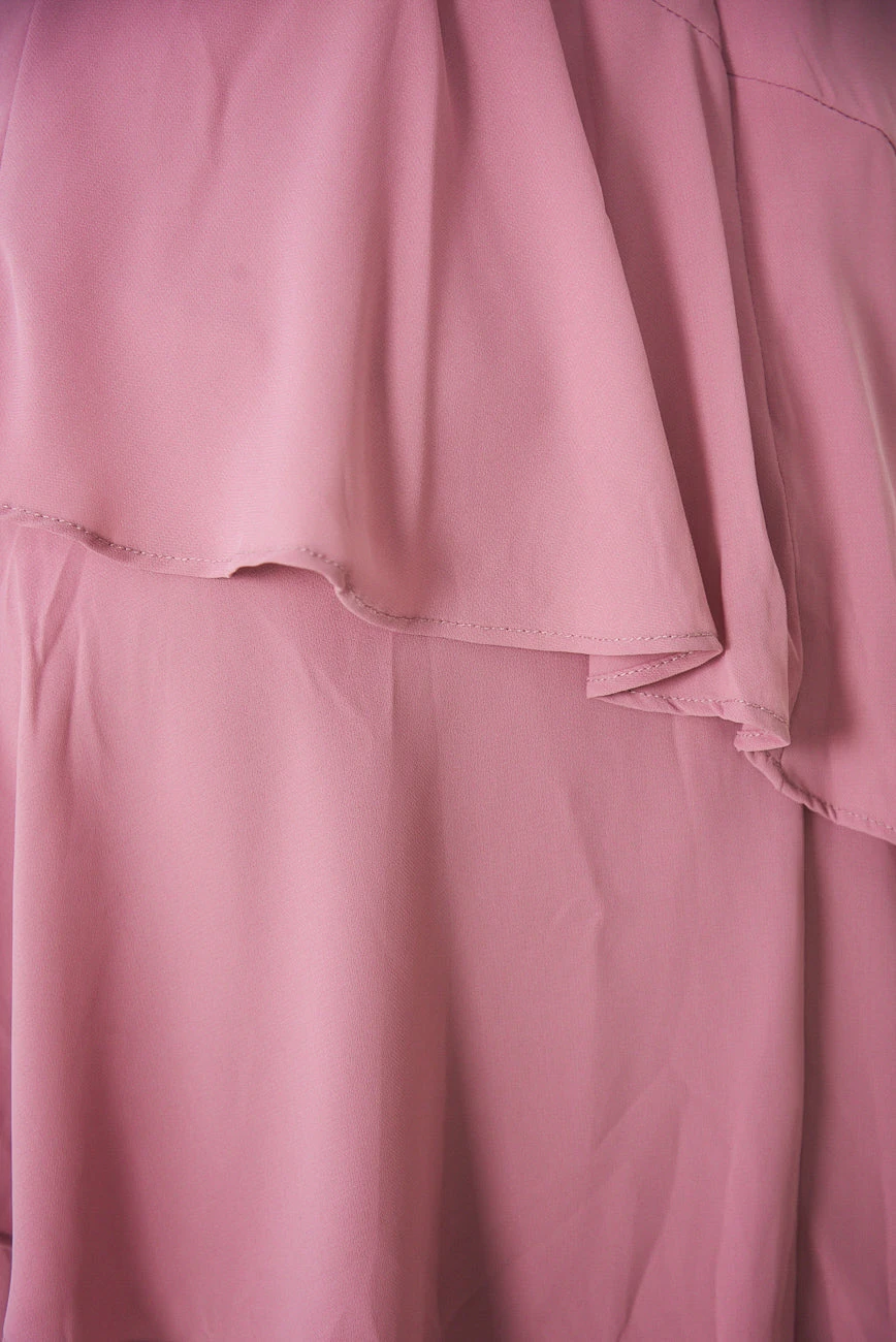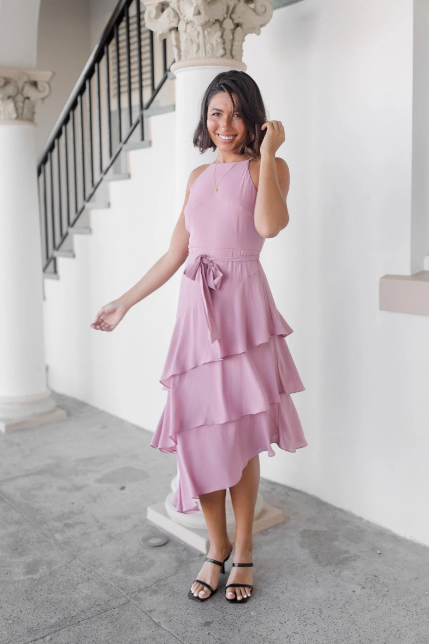 Our Cadence Dress comes in a lovely pink blush tone. This halter neck midi features an adjustable fabric waist tie that cinches in the figure and layered skirt with frill detailing. This piece is perfect for the up and coming summer weddings and work parties.