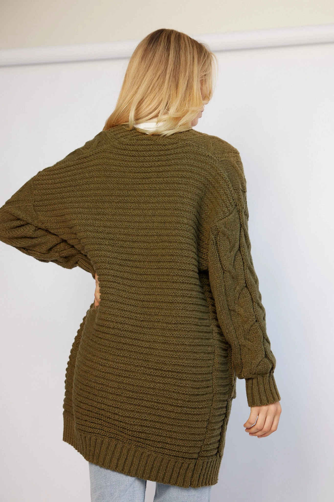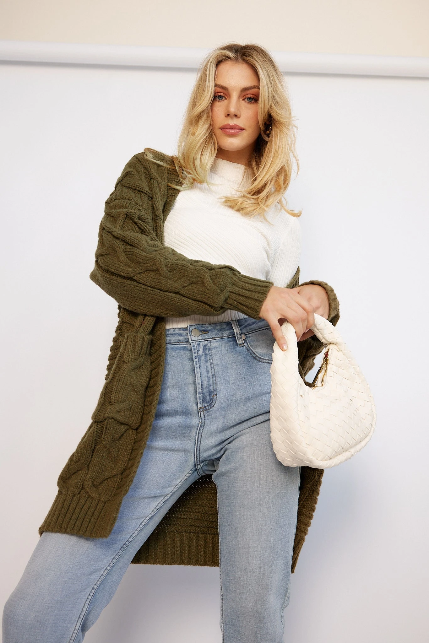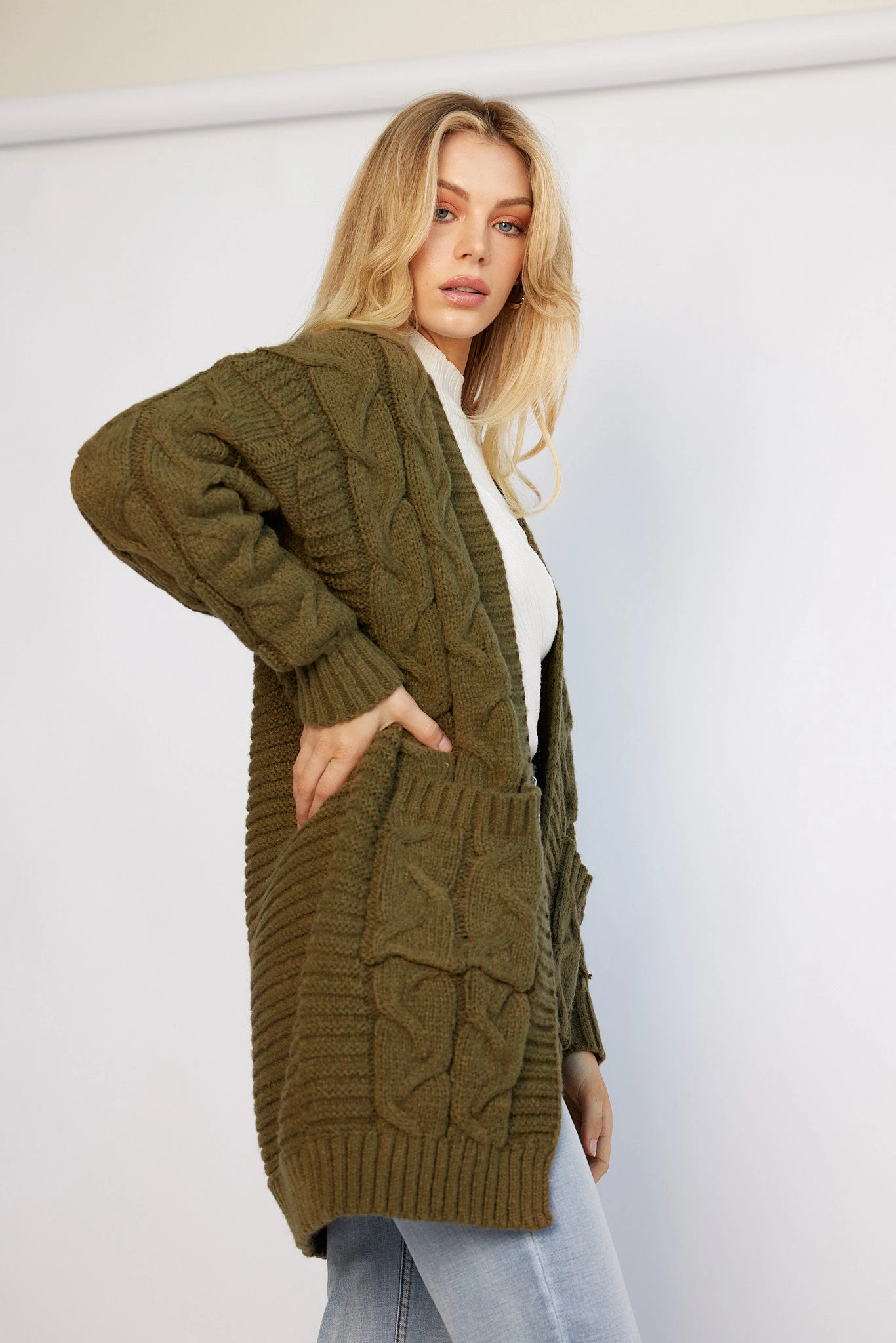 Our Caelyn Cardigan comes in a khaki colour. Communicate stylishly with this outerwear that features an open front, long sleeves, side pockets and long length hem. Pair with a cute tee and skirt!