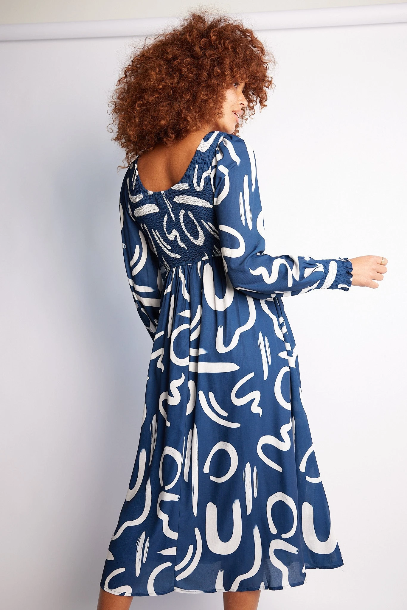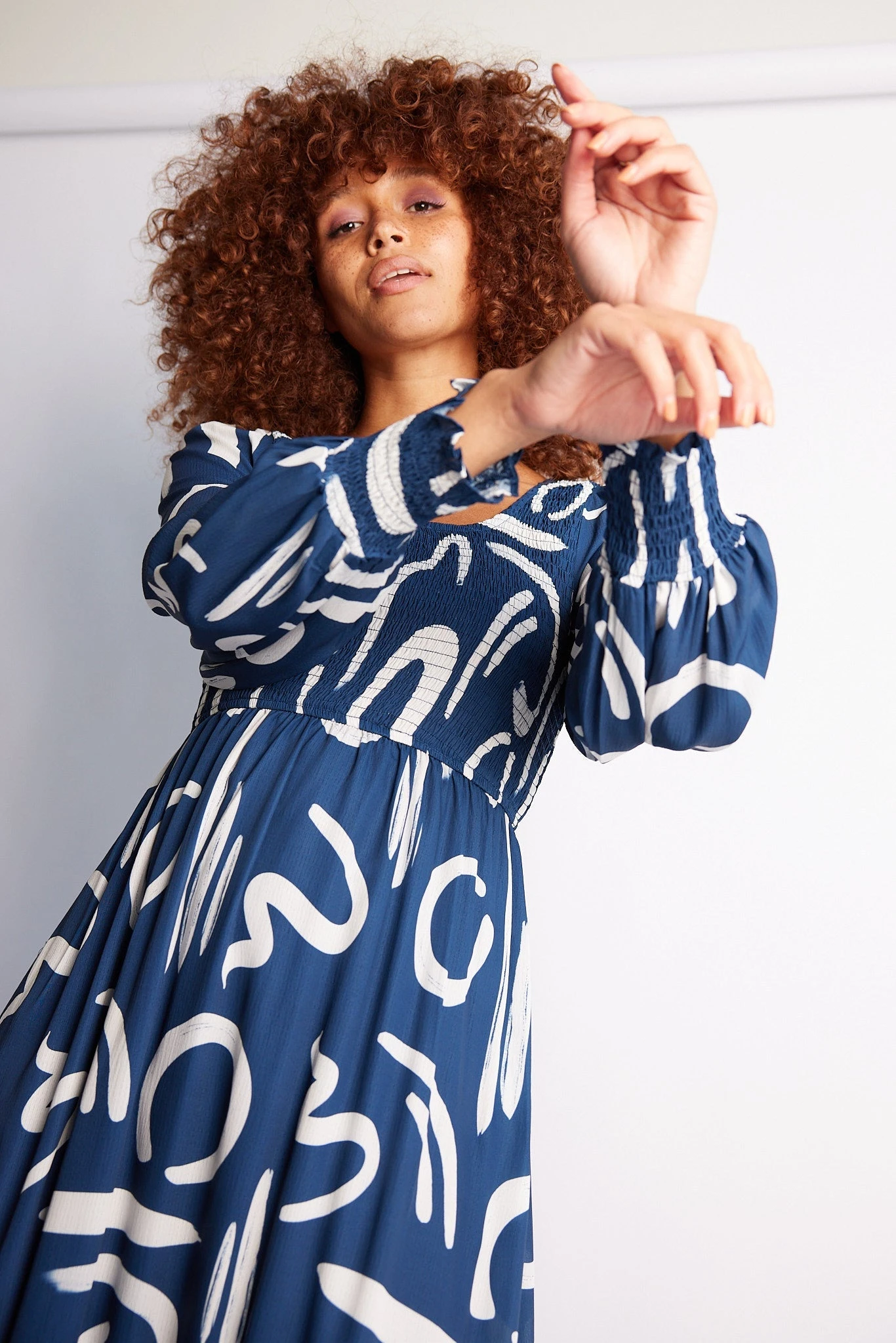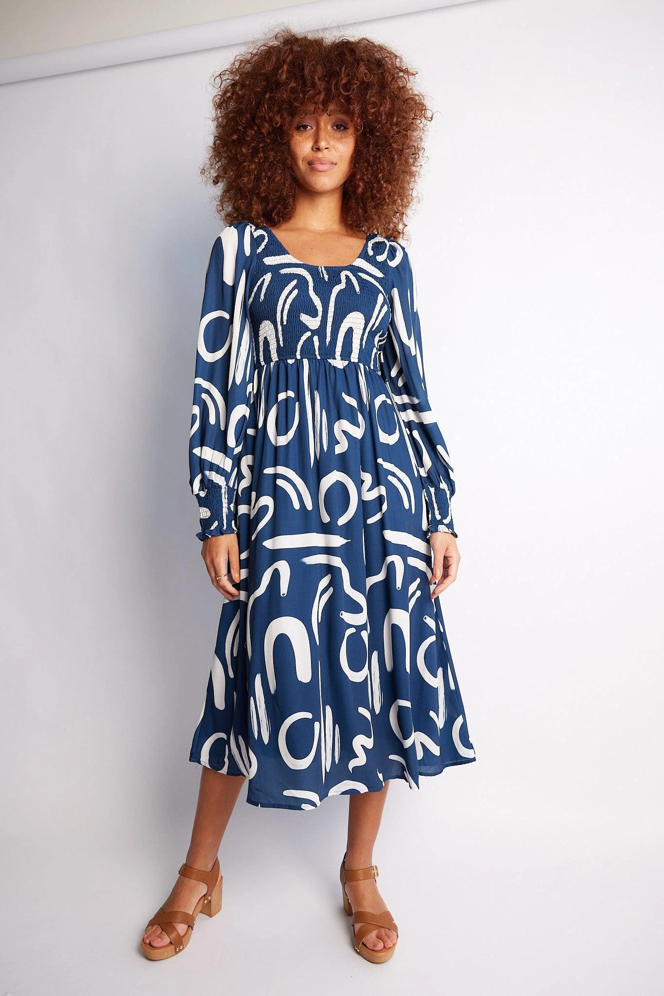 Lulu is 177 cm tall and has an 86 cm bust, 66 cm waist, & 94 cm hips. She is wearing a M / AU 10 / US 6. This dress is true to size.- Key Features: Scoop neckline. Long sleeves. Smocked bodice. Flowy a-line skirt. Midi length.