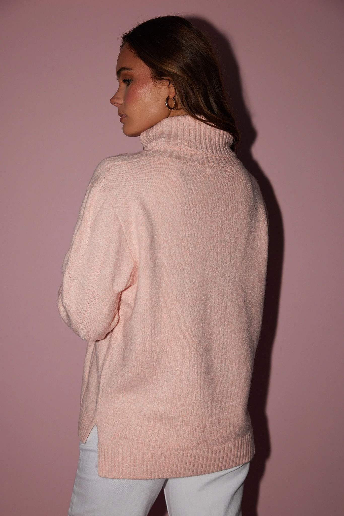 Our Carletta Knit comes in a pink colour. Feel your beautiful self come alive with this jumper that features a high turtle neckline, long sleeves and relaxed fit. Tuck it in a pair of denim jeans and style with block heels!