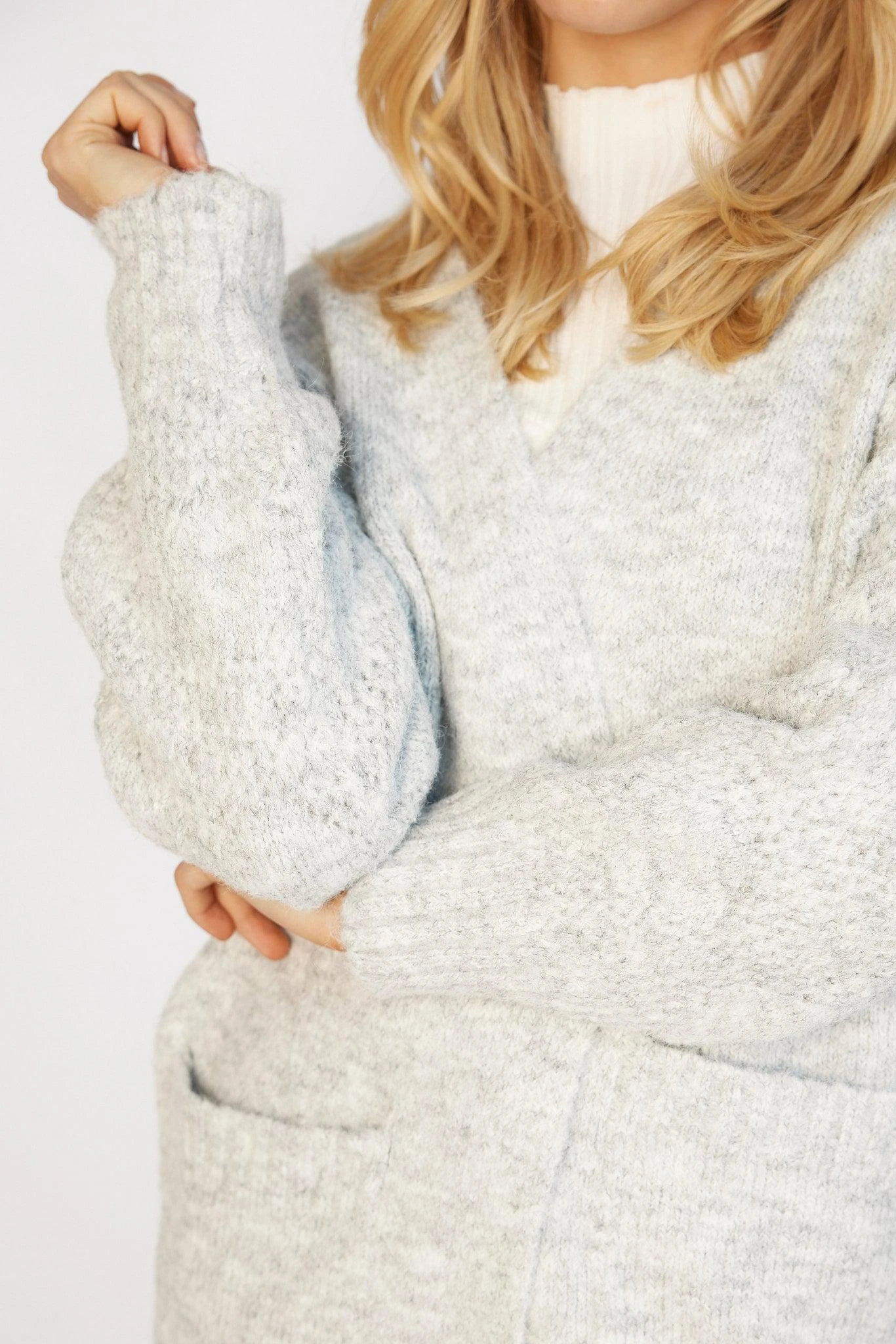 Our Clynten Cardigan comes in a grey colour. A reliable partner for days when you want to look a little more casually put together, this outerwear features an open front, long sleeves, side patch pockets and thigh length hem. Wear over dresses or pants!
