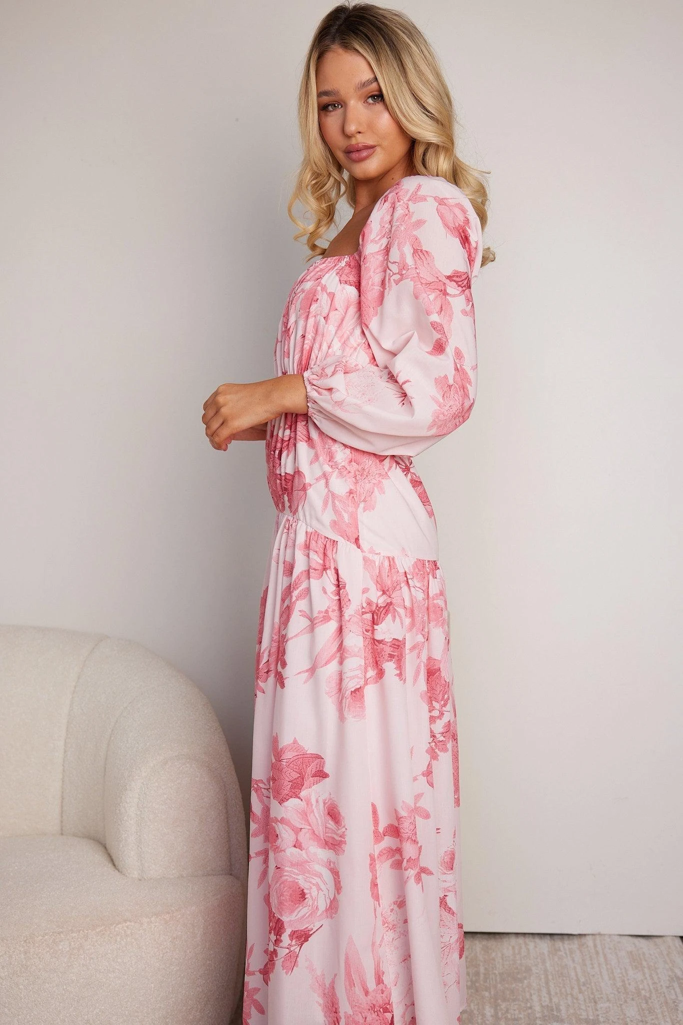 Our Emerley Dress comes in shades of pink. The perfect amount of florals for your garden parties, this maxi is designed with a square neckline, long sleeves, belt with metal clasp and flowy tiered skirt. Style with neutral toned heels!
