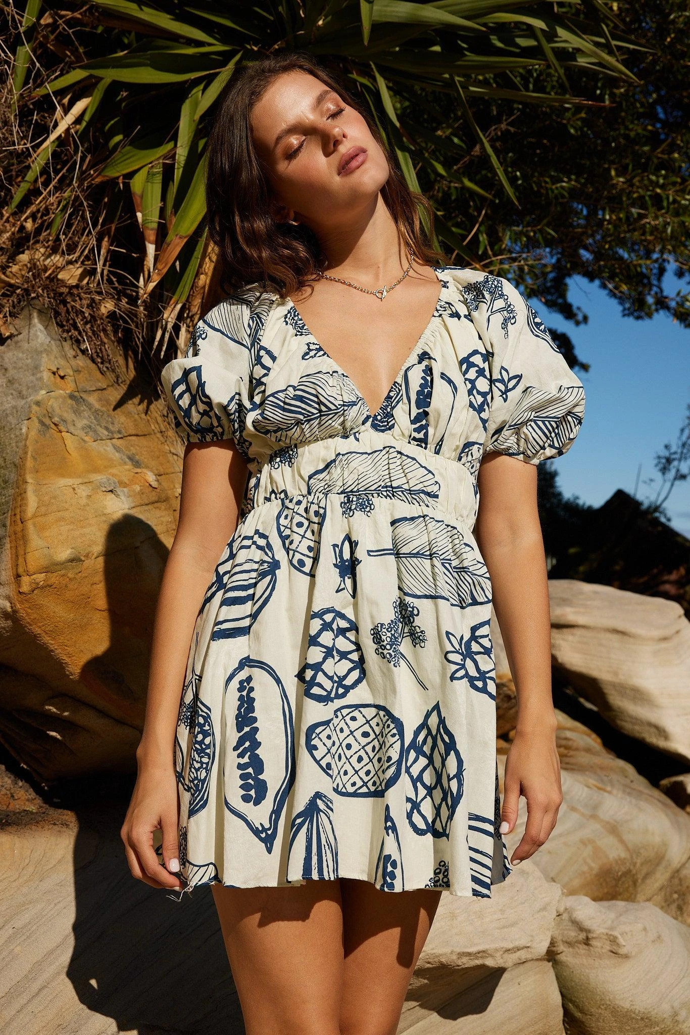 Our Erline Dress comes in a white base with blue prints. Get on your best spring look with this staple that features a low v-neckline, short puff sleeves and mini length skirt. Style it with flats for a casual look or heels to dress it up!