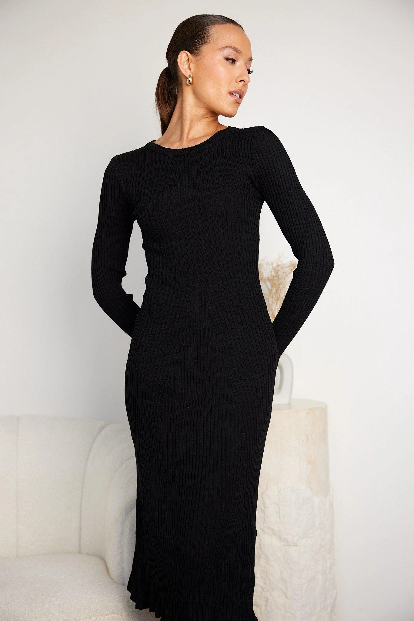 Our Gila Knit Dress comes in a black colour. Thriving through the cold season, this classic bodycon staple will be your new favourite with its lovely hue, round neckline, long sleeves and midi length hem. Wear as is or style with a coat!