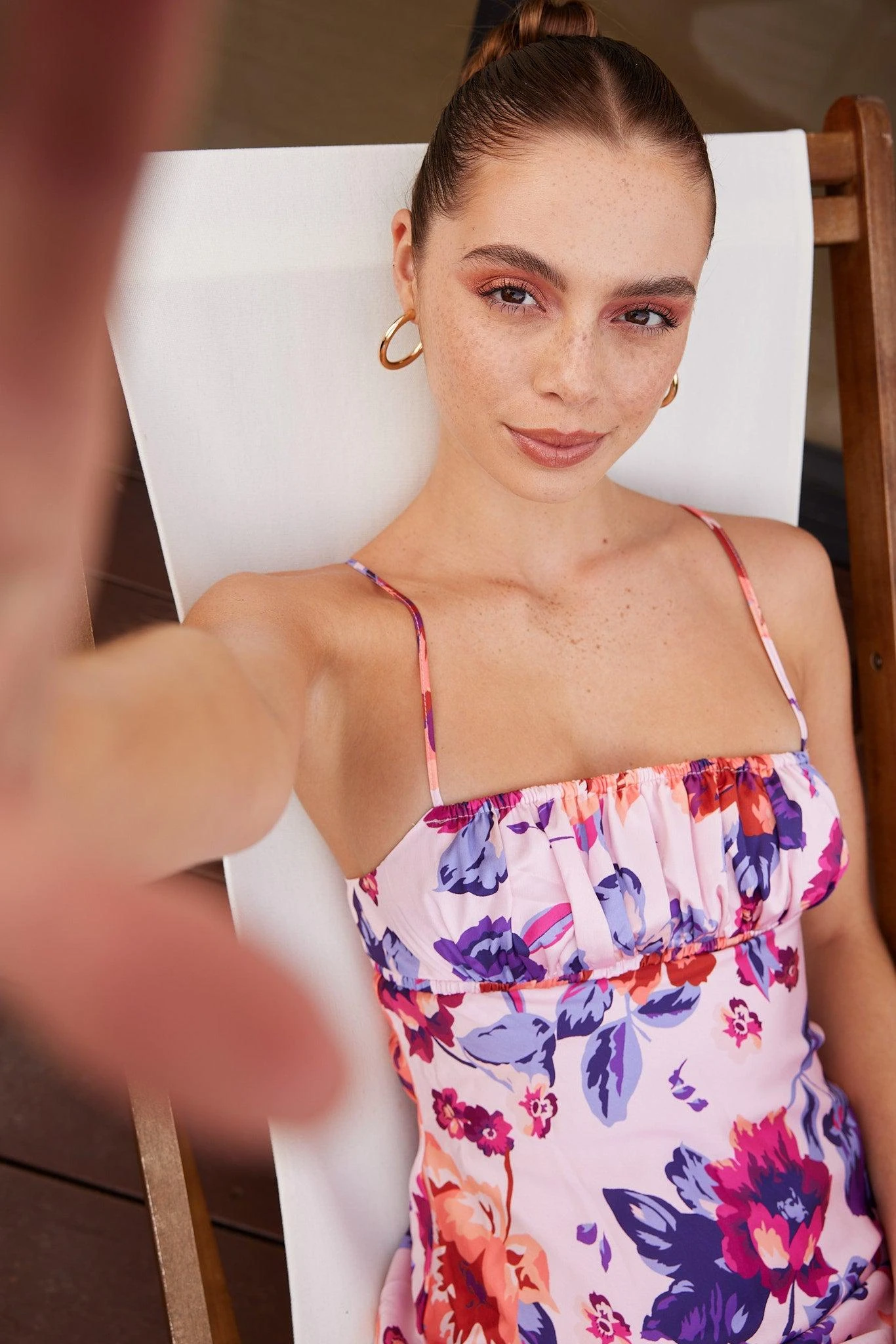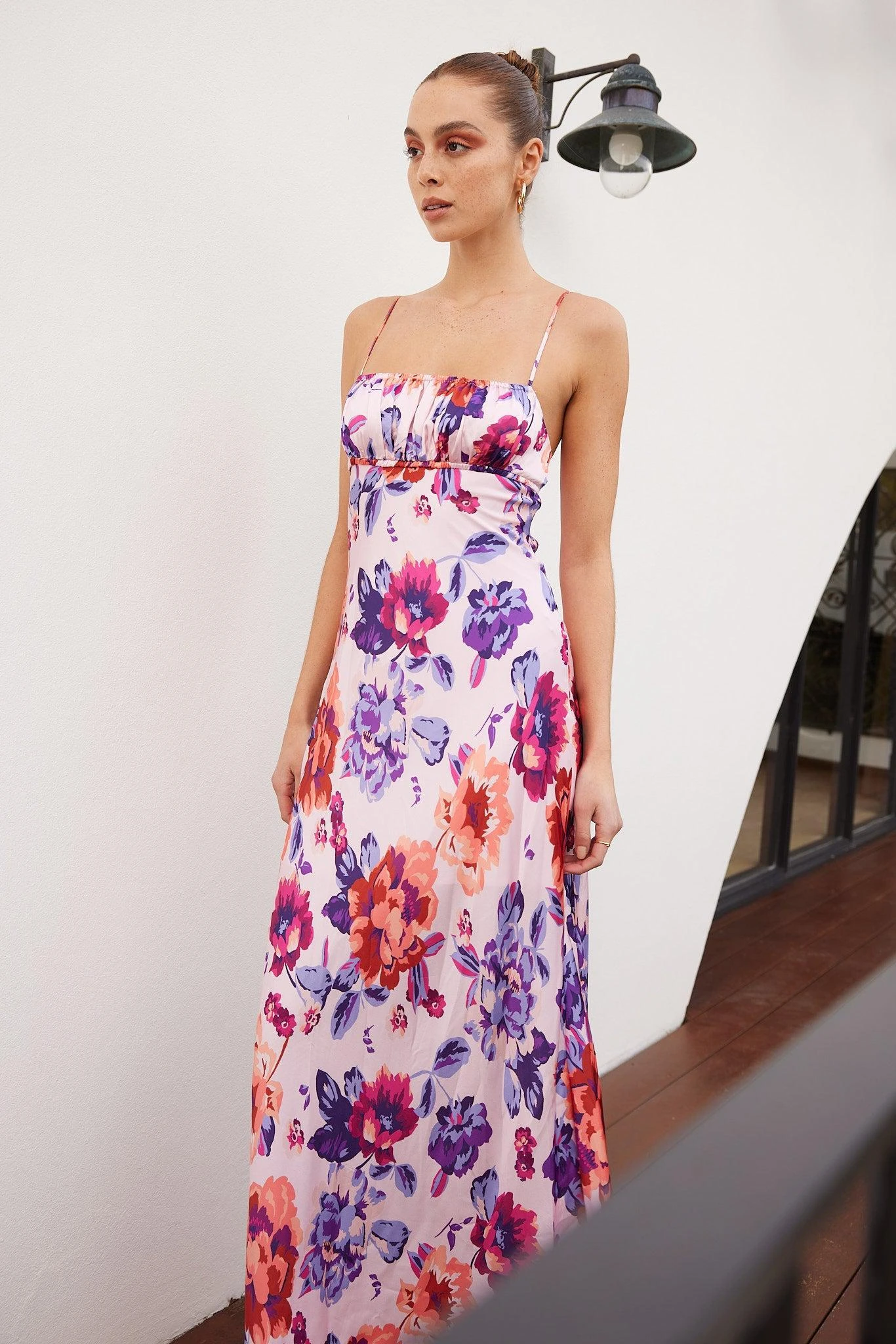 Our Hartwinne Dress comes in a pink base with multicoloured floral prints. For days when you’re feeling extra feminine, this staple is designed with spaghetti straps, square neckline, gathered bust, empire waist, straight skirt and maxi length hem. Style with pearl earrings!