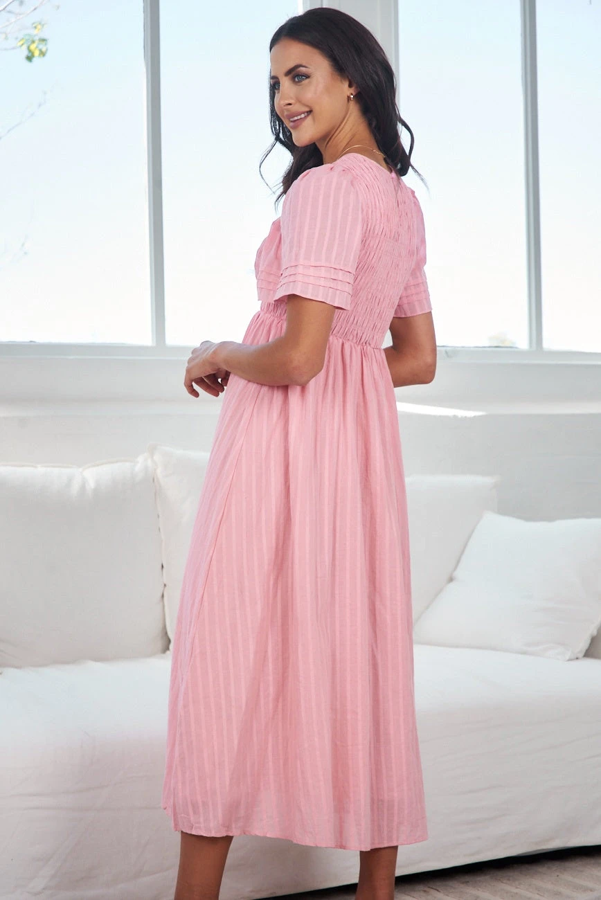 Our Iolana Dress comes in a soft pink tone. It features a round neckline, short sleeves and a textured pattern across the chest. This stunning midi pairs wonderfully with boots or heels for a stunning formal look!