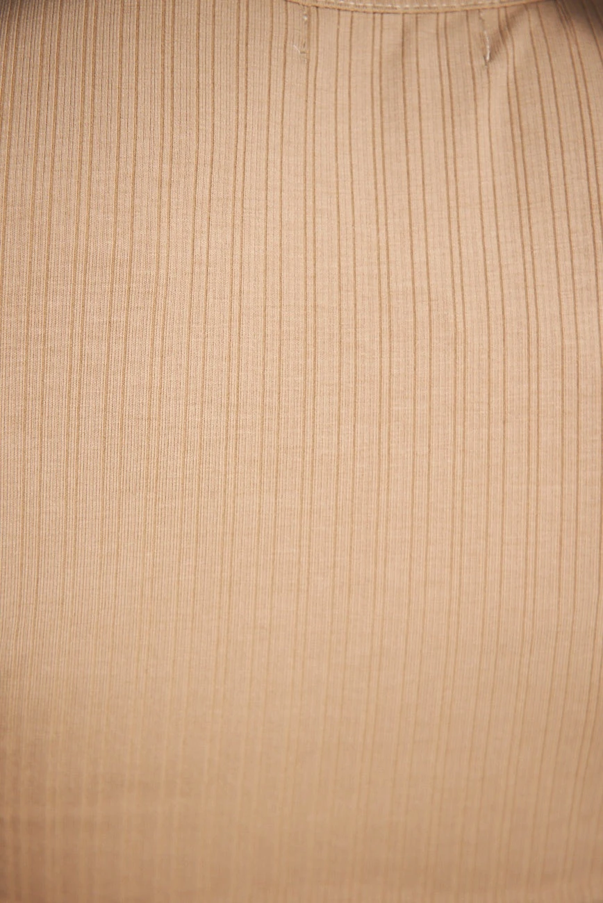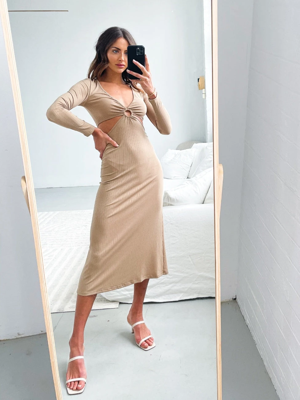 Our Justina Dress comes in a neutral beige tone. It features a plunging v neckline, long fitted sleeves, a skirt split on the front left side, and a cutout at the midriff. This two-piece still midi pairs beautifully with heels for an effortless transseasonal look!