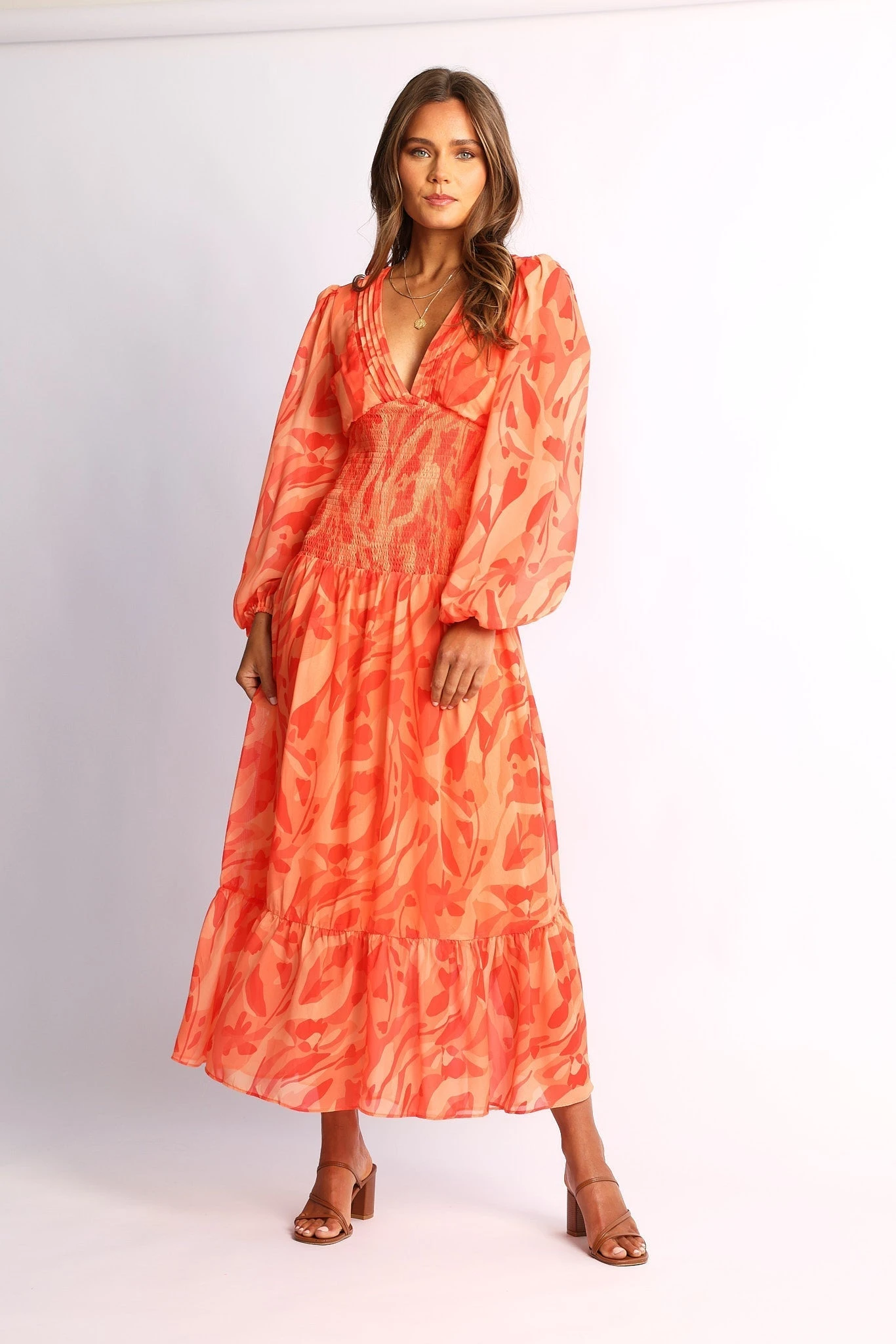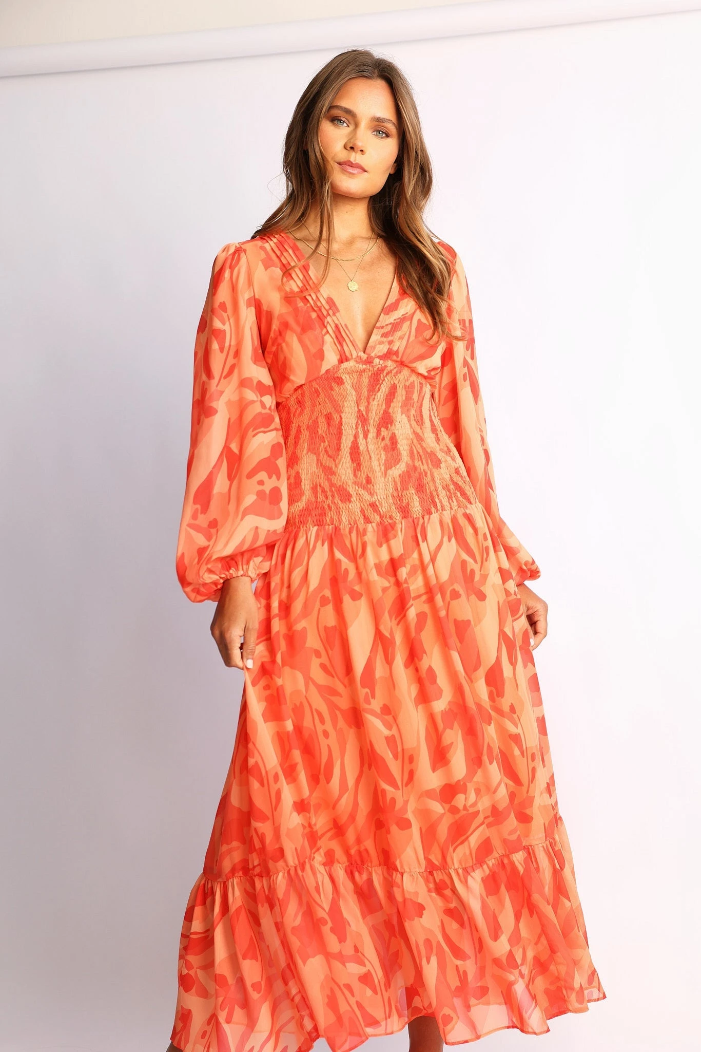 Our Jyra Dress comes in a beautiful print in shades of orange. A no-fail formula for an easy glam look, this maxi is designed with a low v-neckline, long bishop sleeves, smocking from waist to hips and flowy skirt. Look brighter with a fun-hued heels!