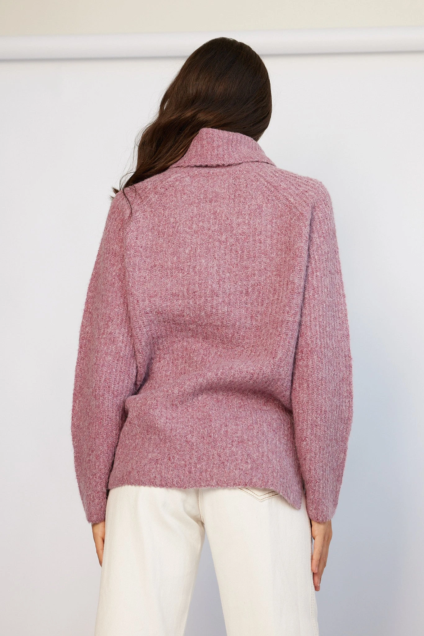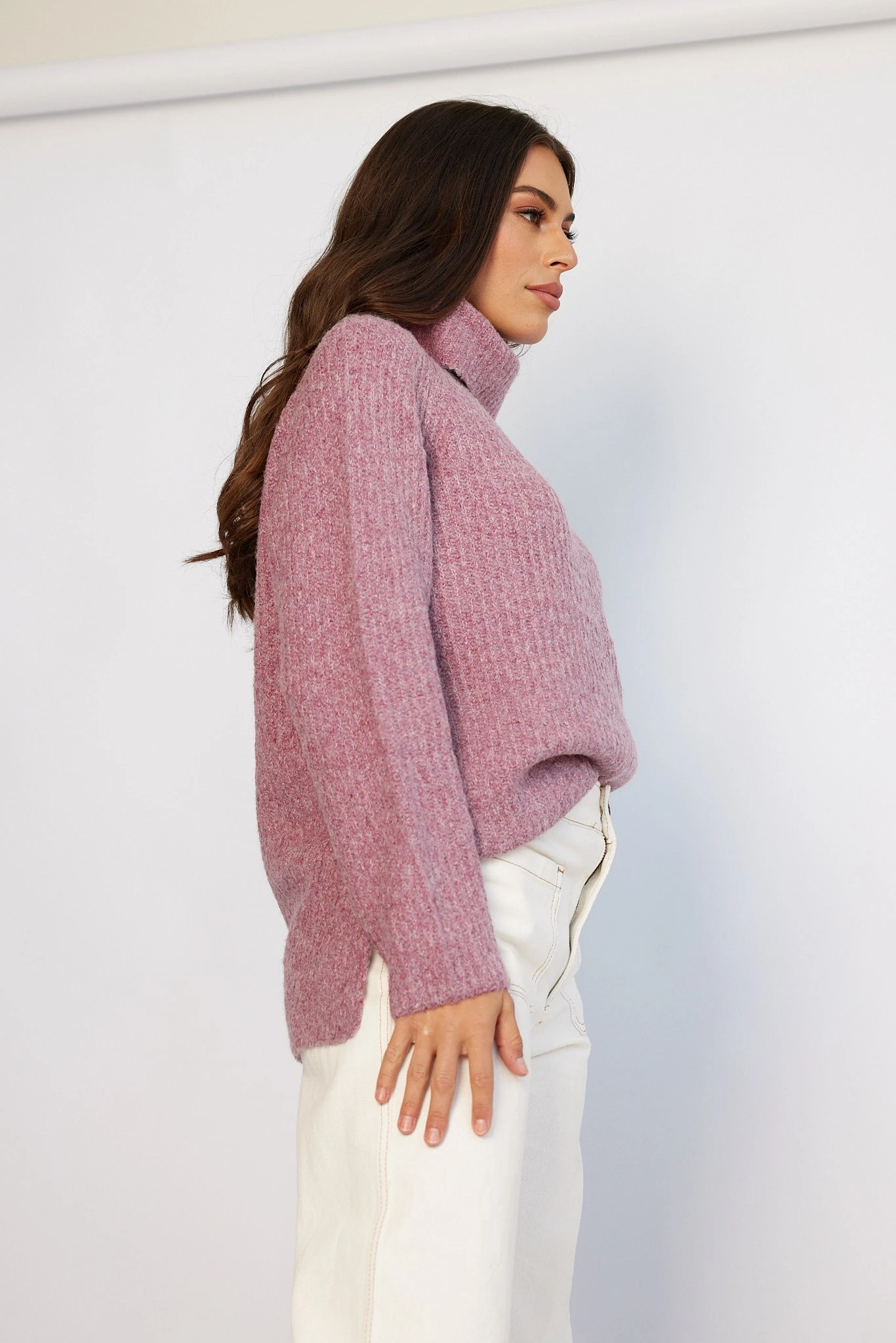 Our Karlen Knit comes in a purple colour. Block out the cold with this top that features a turtle neckline, long sleeves and relaxed fit. Style with high waisted skinny jeans and casual shoes!