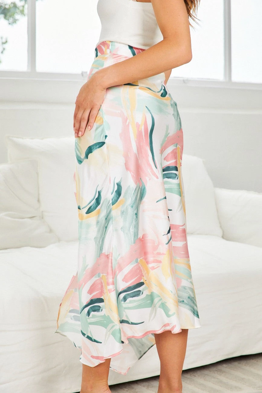 Our Korrina Skirt comes with tones of blush, sage, peach, and black prints on a white base. It features a midi-length & an elasticated waistband for a relaxed, comfortable fit. This flowy midi pairs beautifully with heels for a stunning spring look!