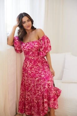 Our Lanora Dress comes in a floral print in shades of pink, red, orange and white. Give your winter wardrobe a break with this spring-ready staple that features spaghetti straps, curvy square neckline, tight bodice, flowy a-line skirt with slit and midi length. Style with wedge heels and a headband!