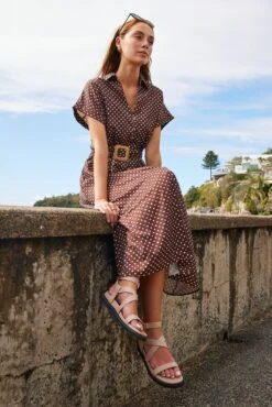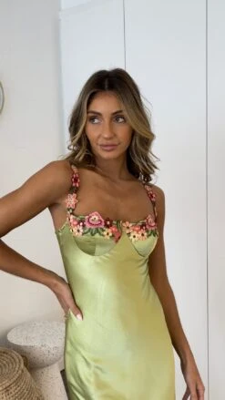 Emma is 173 cm tall and has an 81 cm bust & 61 cm waist. She is wearing a size 6. This dress is true to size.- Key Features: Spaghetti straps. Flowy a-line skirt with slit. Midi length.