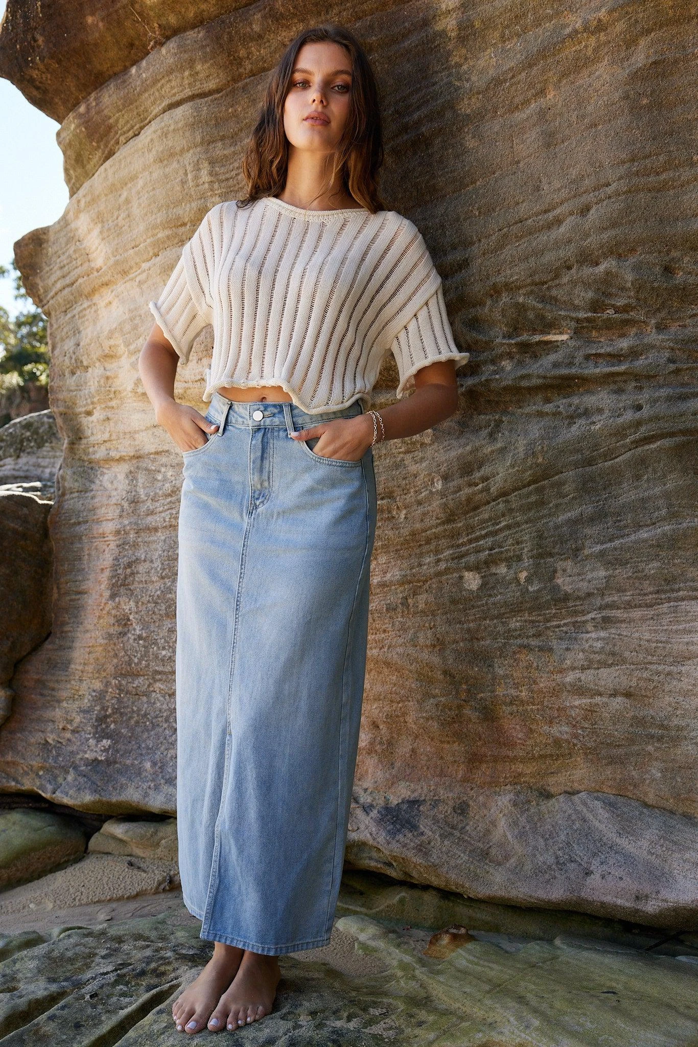 Our Larice Skirt comes in a blue colour. Relive the 90โs trend vibe in this denim staple that features a high waist fit, side pockets, button and zip closure, front slit and midaxi length hem. Look classic with a tight knit top and block heels!