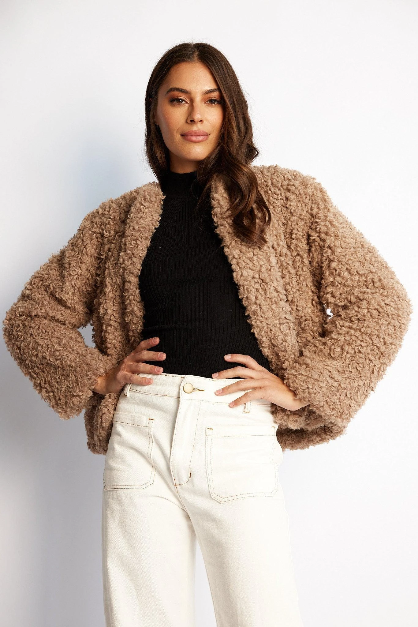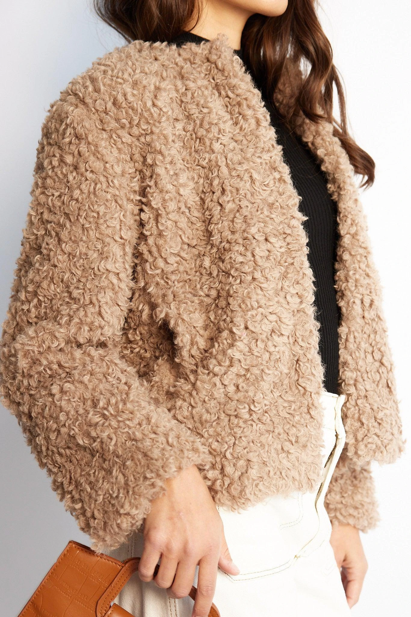 Our Latricia Jacket comes in a beige colour. Set the bar in the fashion scene with this teddy jacket that features an open front, long sleeves and relaxed fit. Pair with a crop top and wide legged pants!