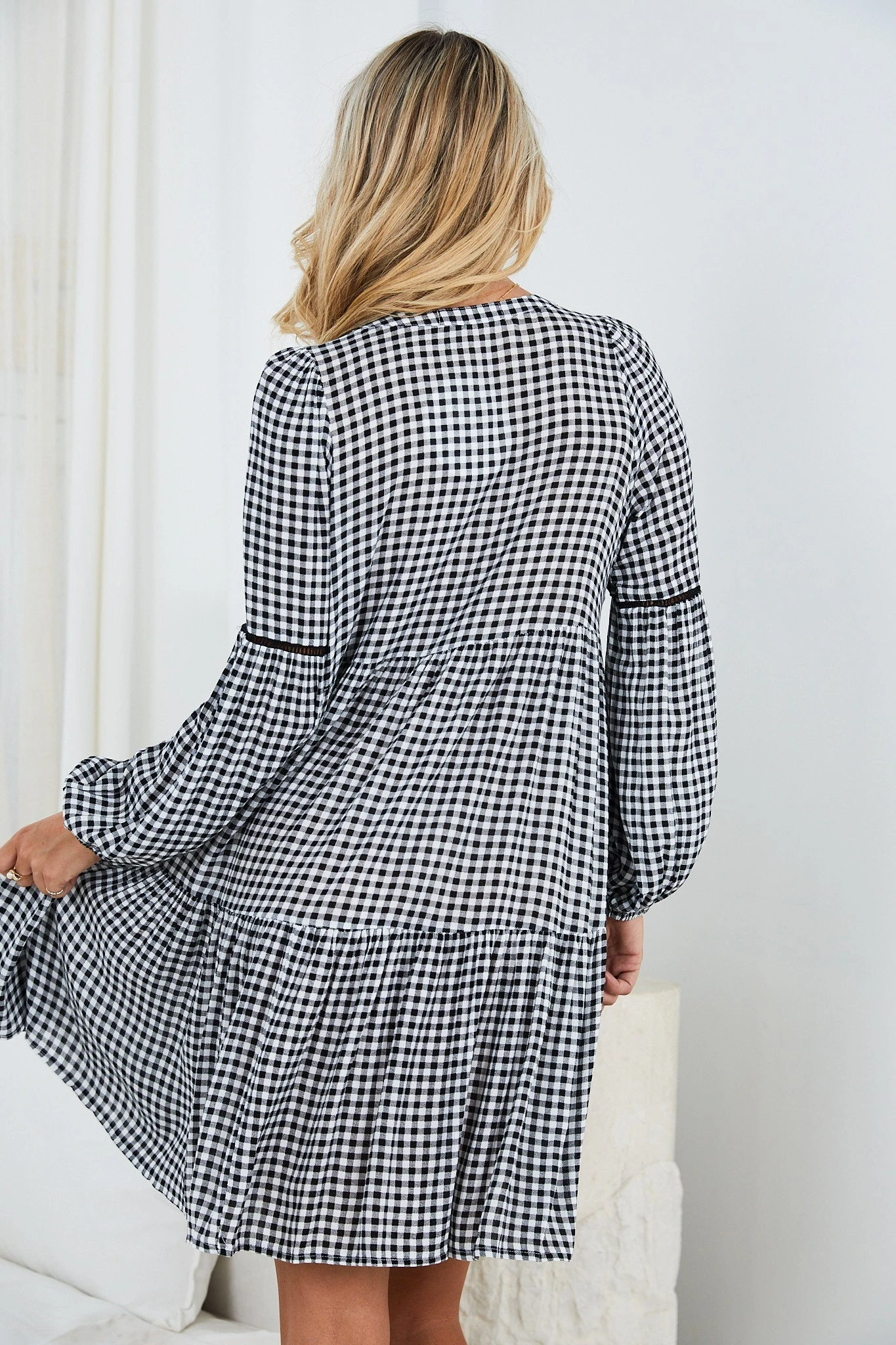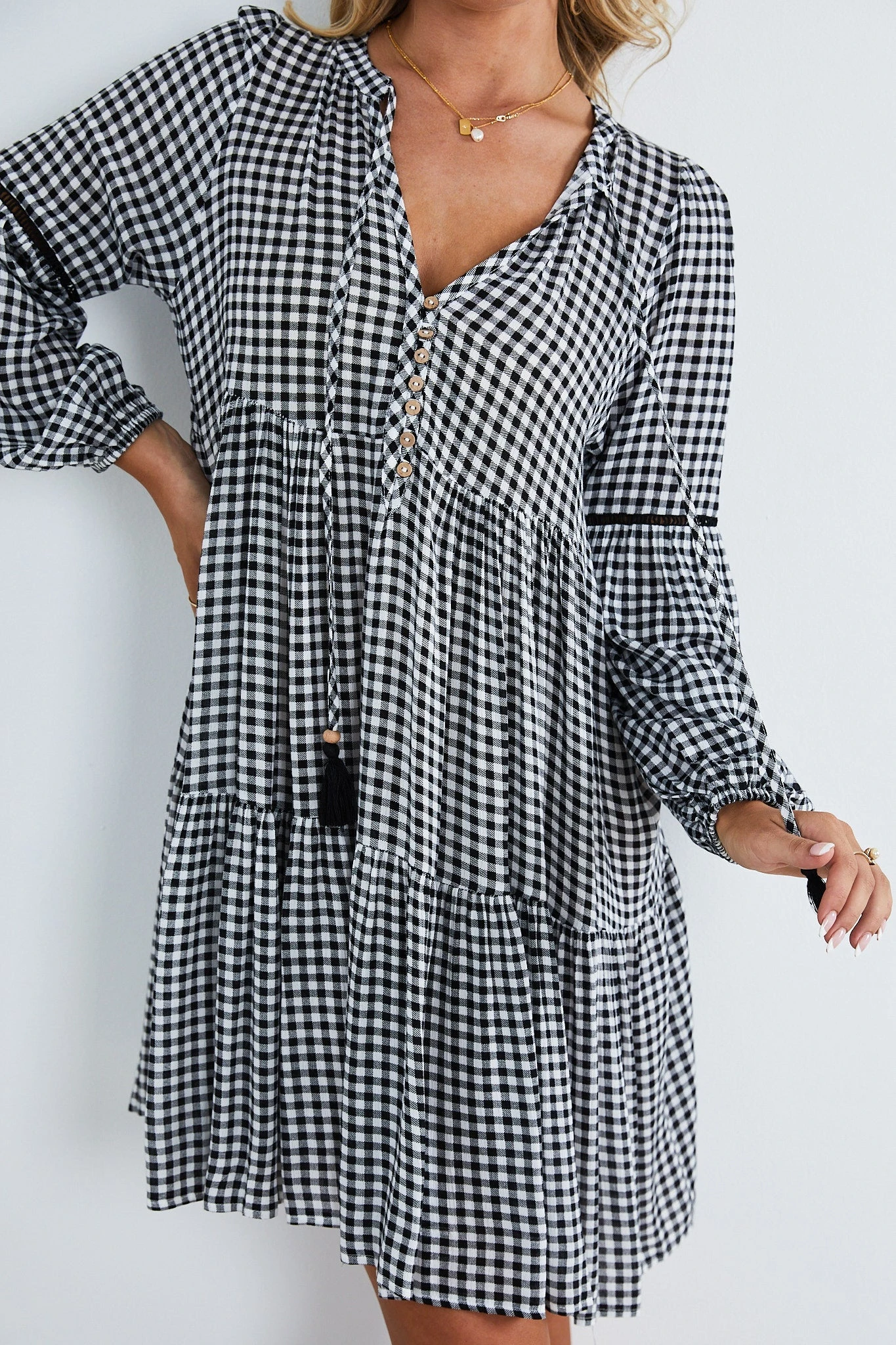 Our Ludmilla Dress Dress comes in a black check print. This dress features long sleeves, and a tiered skirt, v neckline with tassels and buttons met at the middle are a unique, fun addition to this piece! The relaxed fit mid pairs beautifully with tan sandals and gold accessories for brunch dates!