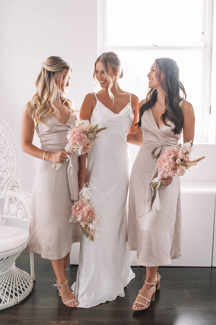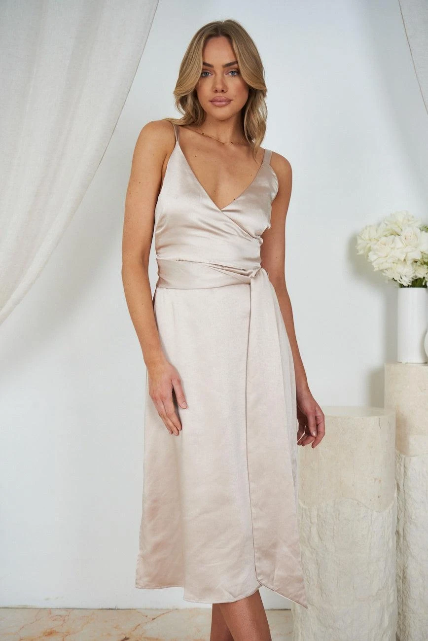 - Key Features: Champagne with silver undertones – sheen finish. Medium weight non-stretch fabric. Lined front bust (not sheer). Unlined back bust and skirt (not sheer). Slits on sides (approx. 26cm). Wrap bust. Adjustable thick straps (approx. 1.5cm). Invisible zipper on wearer’s left. Silver hardware detailing on straps