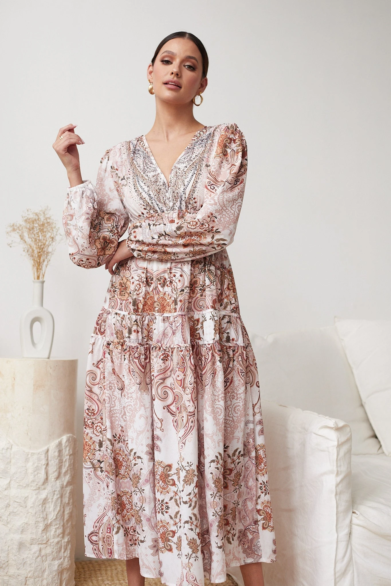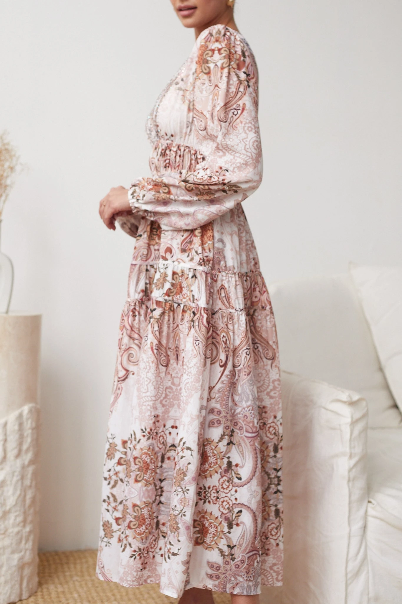 Sinead is 168 cm tall. She is wearing a S / AU 8 / US 4. This dress is true to size.- Key Features: Plunging neckline. Long bishop sleeves. Gathering on waist. A-line tiered skirt. Maxi length.