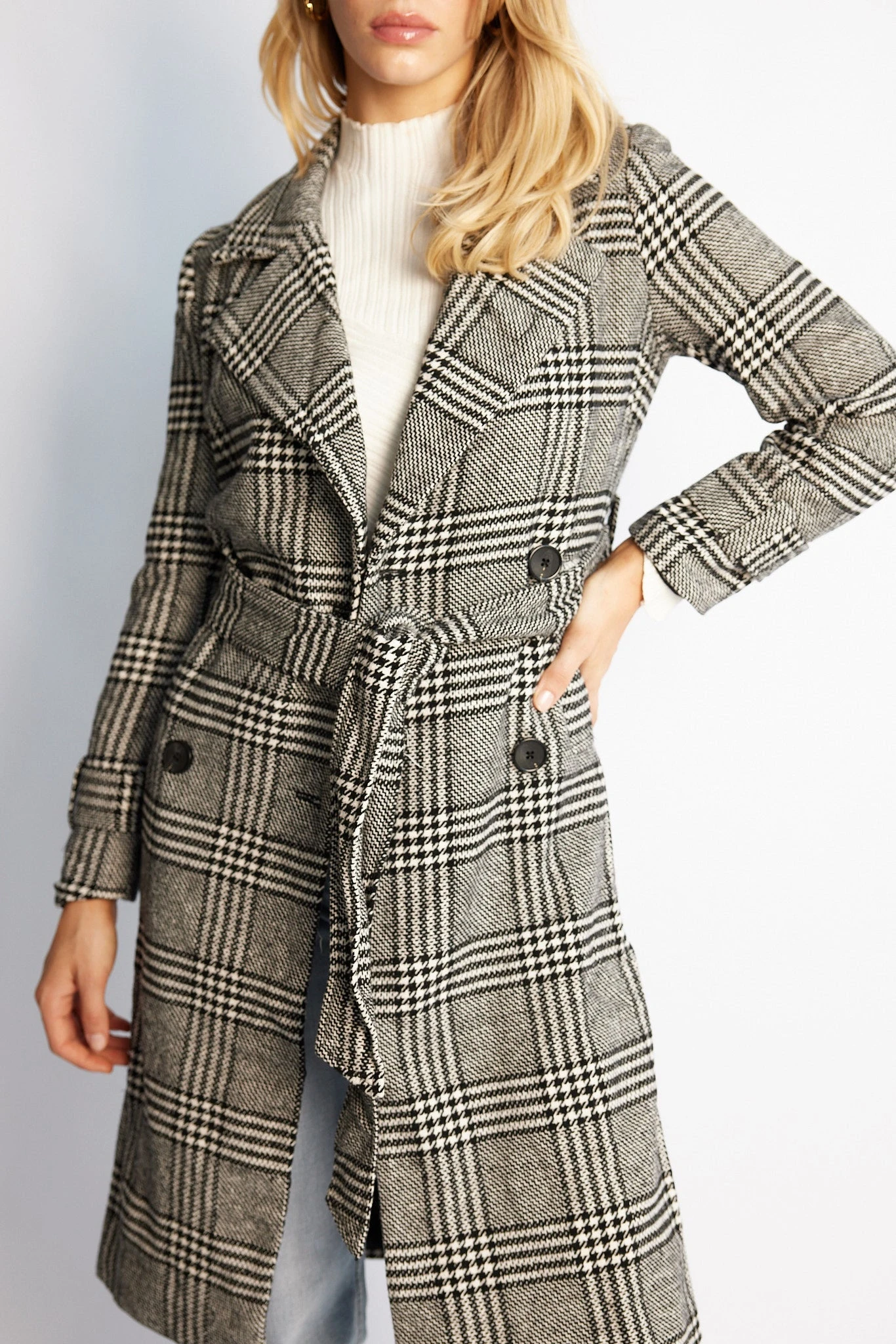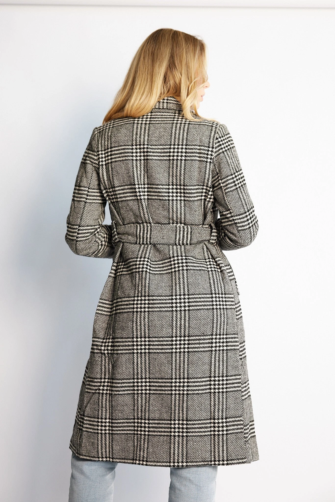 Our Shanice Coat comes in a grey, black and white print. It features traditional lapels, long sleeves, buttons on the front, and a waist tie to cinch the coat around the figure beautifully. This coat is perfect for casual outings or taking on the day at the office during the cold winter months!