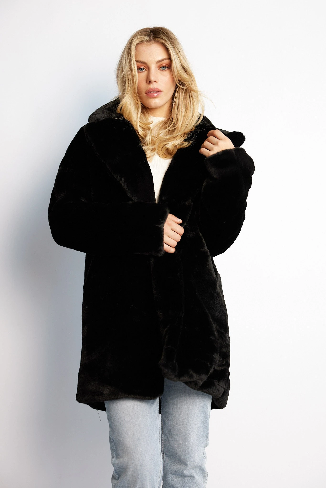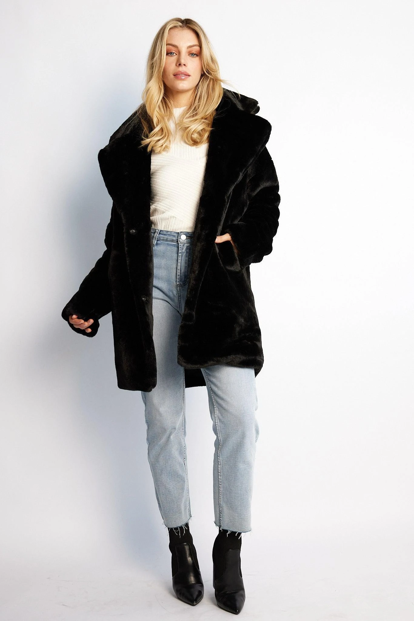 Our Tamasha Coat comes in a black colour. Dress your fabulous self with this outerwear that features a notched lapel collar, long sleeves, button closure and thigh length hem. Wear with a knit bodycon dress and high heels