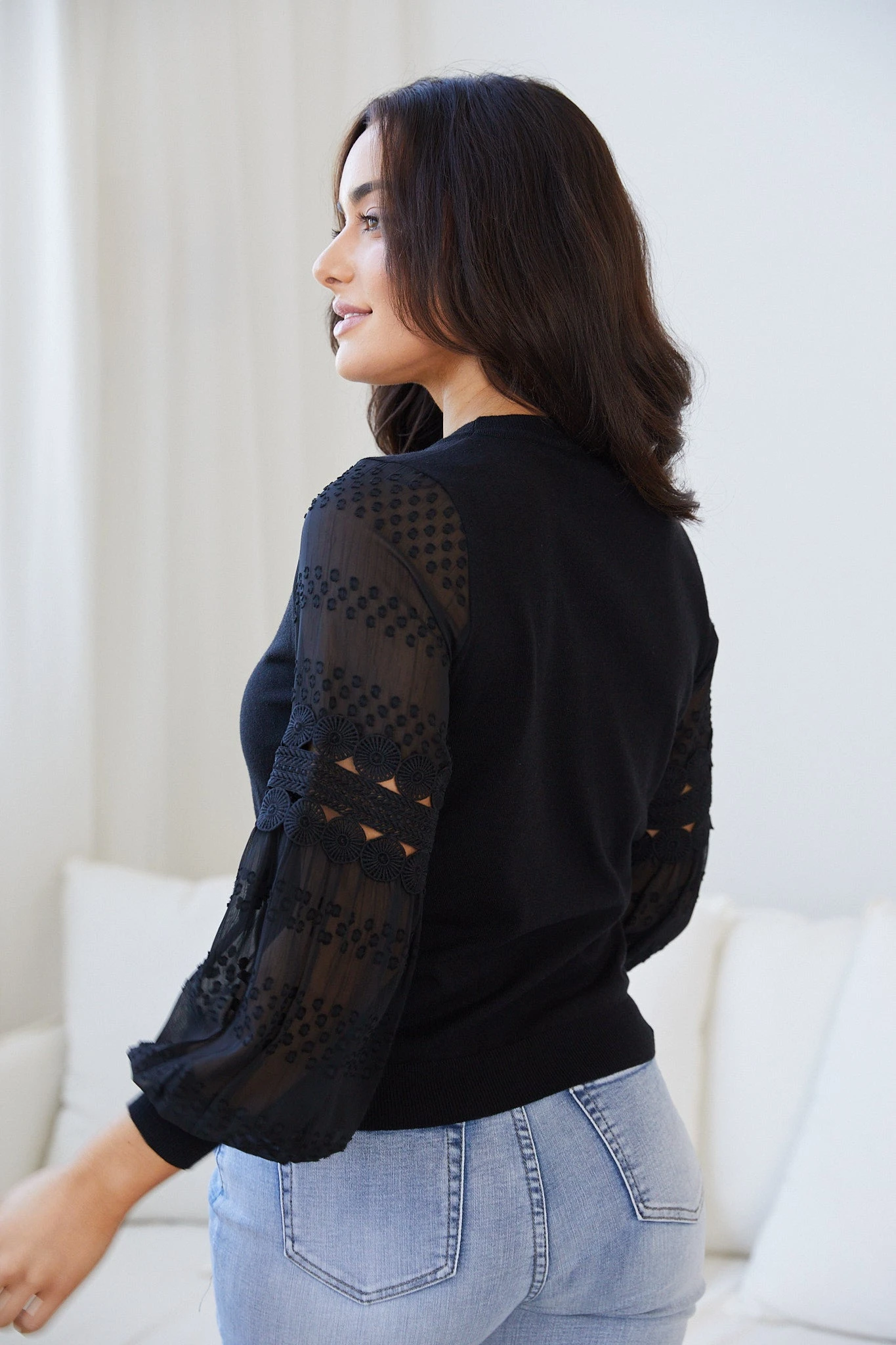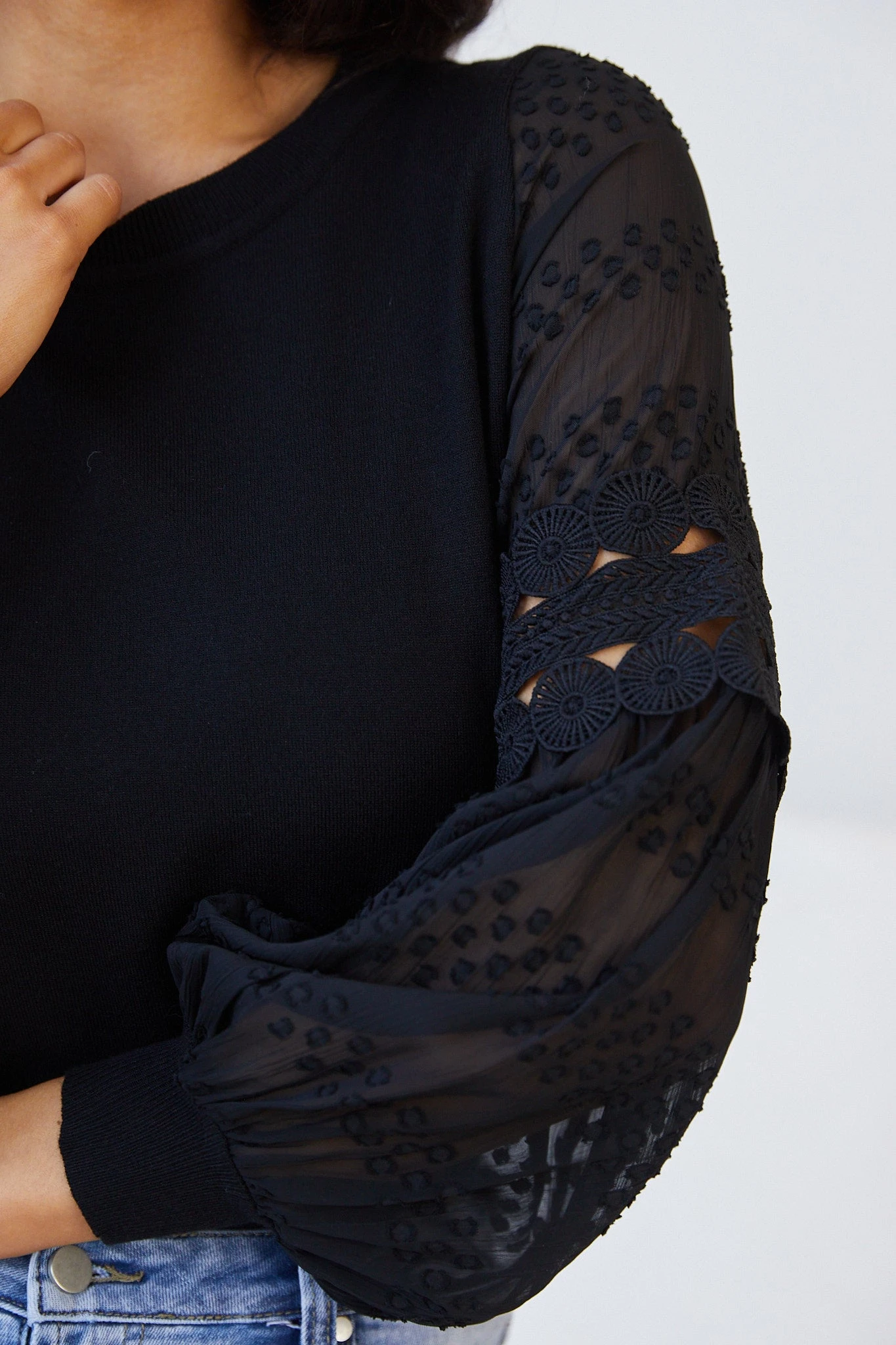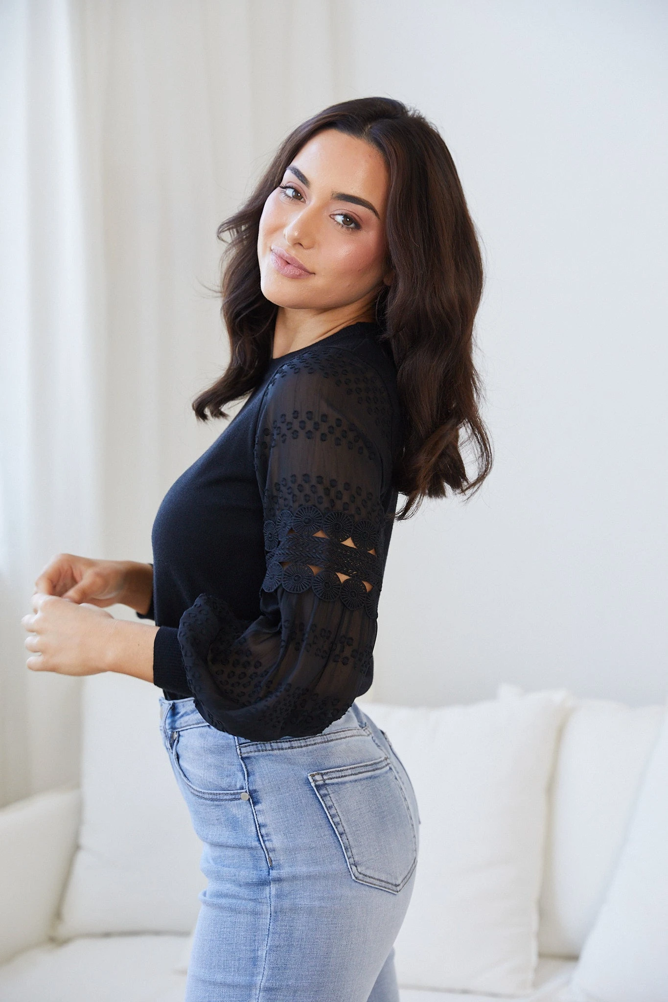 Our Tia Knit Top comes in a deep black tone. It features a round neckline, long relaxed sleeves, and an embroidered pattern on the sleeves. This versatile top is perfect for casual outings with the girls, or taking on the day in the office!